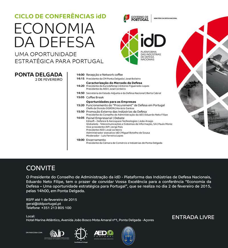 Ciclo de conferências idD – Ponta Delgada | 2 de fevereiro idD Portugal2021-06-15T13:47:55+00:0018 de Agosto, 2015|Tags: Ciclo de Conferências, idD Portugal Defence, Ponta Delgada|Partilhe este artigo, escolha a sua plataforma!FacebookXLinkedInWhatsAppEmail (necessário mas não publicado) Artigos relacionados Indústria de Defesa Nacional com volume de negócios record Gallery Indústria de Defesa Nacional com volume de negócios record 30 de Março, 2026 Marinha Portuguesa assina contrato de 42,3 milhões de euros com a EID Gallery Marinha Portuguesa assina contrato de 42,3 milhões de euros com a EID 28 de Março, 2026 Conferência “Desafios e Oportunidades Investimento Indústrias da Defesa” Gallery Conferência “Desafios e Oportunidades Investimento Indústrias da Defesa” 24 de Março, 2026 IX Congresso dos Gestores Portugueses: Defesa, Pilar da Inovação e Crescimento Gallery IX Congresso dos Gestores Portugueses: Defesa, Pilar da Inovação e Crescimento 23 de Março, 2026