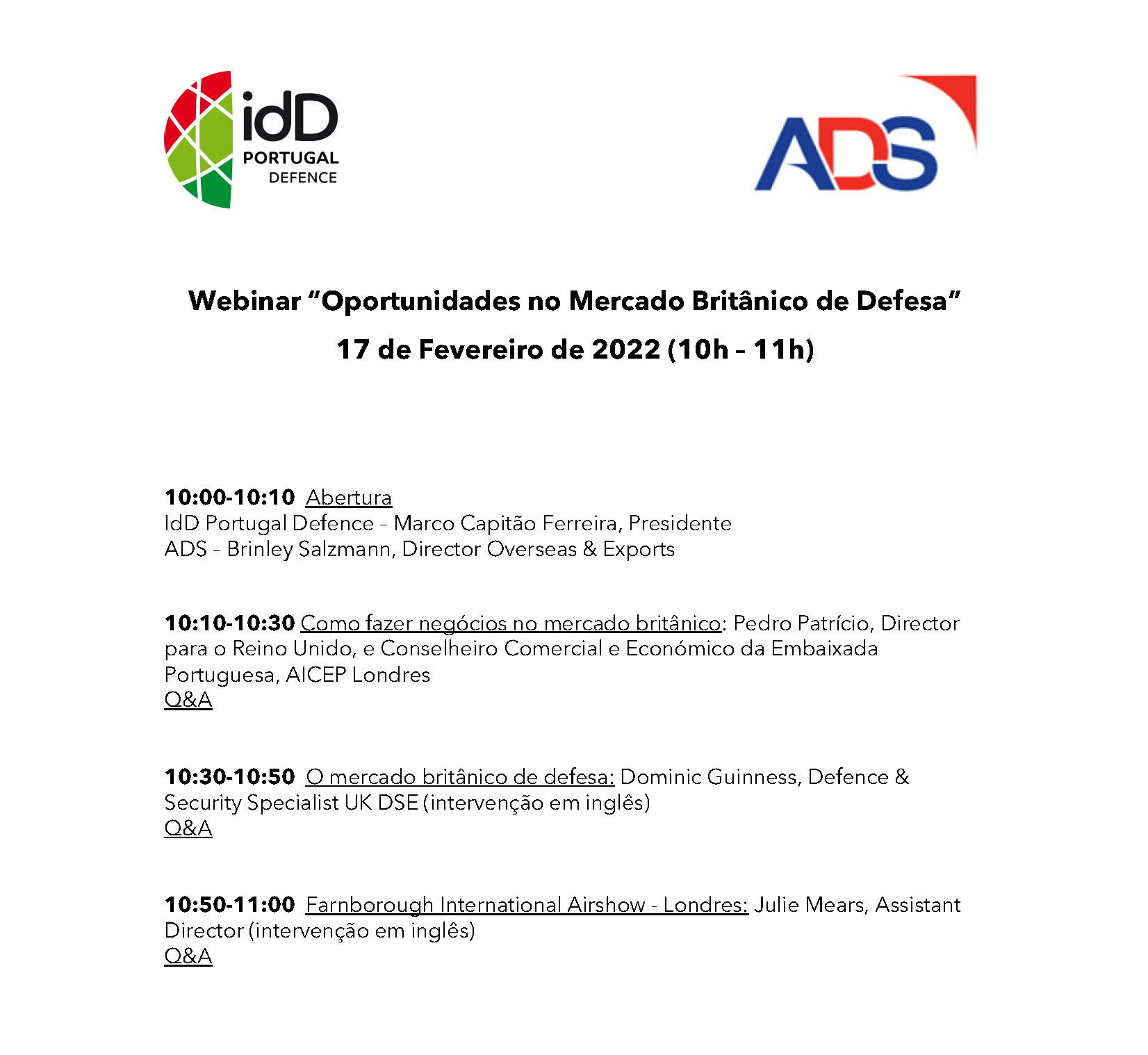 Realizou-se, no dia 17 de fevereiro em colaboração com a ADS Britânica (Aerospace, Defence Security & Space), o Webinar “Oportunidades no Mercado Britânico de Defesa” com o objetivo de dar a conhecer melhor as oportunidades do mercado britânico e saber o que mudou com o Brexit.